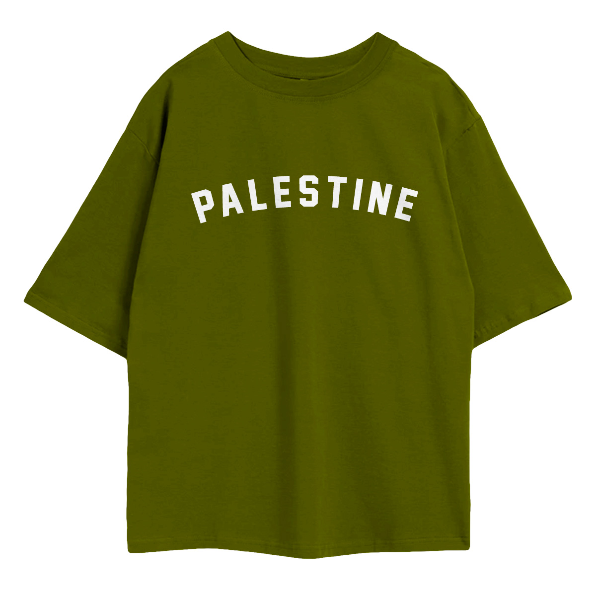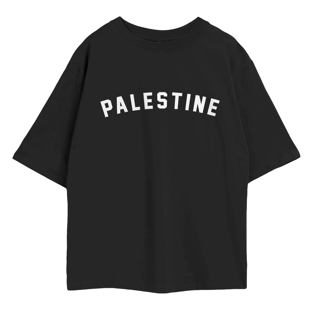 The Palestine Oversized Shirt is as bold in its design as it is in its message. The word PALESTINE arches powerfully across the upper chest in large, varsity-style block lettering — clean, commanding, and impossible to miss. No need for slogans, no need for elaboration — the name alone says everything.